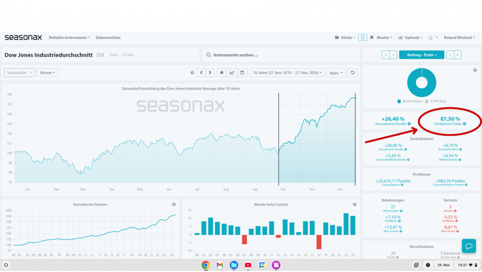 Ich bin seit Anfang Oktober 2024 im Dow Jones ETF investiert und werde Ende Dezember diese Position wieder schließen. Per Ende November 2024 (Erstellung dieses Beitrages) liegt die Wertsteigerung - die für jeden einfach einzusehen ist - bei ca. 10 Prozent.