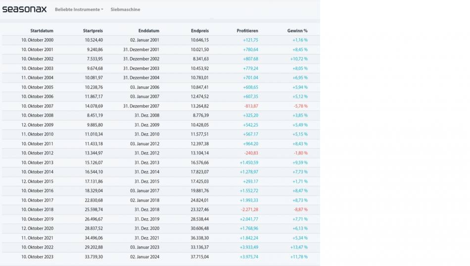 Dabei wird eine Erfolgsquote von 87,5% ausgewisen. Konkret heisst das, dass es in den letzten 24 Jahren nur 3 Jahre gab, in denen kein positives Ergebnis erreicht wurde. (Mit Klick auf das Bild kannst du dieses vergrößern)